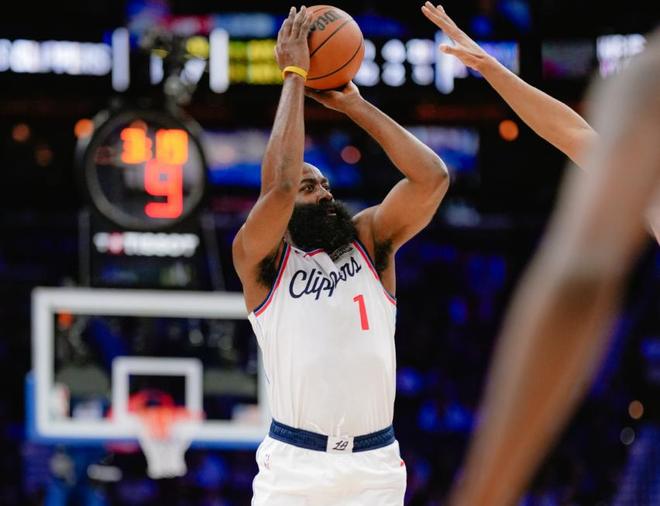 其实恩比德和乔治处境也比哈登好,缺了恩比德和乔治,76人还能靠泰马克西和探花郎埃奇库姆(VJ)撑起场面;快船只能靠36岁的哈登一个人死撑。快船此役的首发阵容寒酸得令人心疼:哈登+邓恩的后场,锋线是新秀桑德斯+科林斯,内线祖巴茨独木难支。开局阶段哈登体能充沛,快船一度领先12分,他个人也轻松突破生涯28000分大关。可第三节哈登体能下滑后,一切都变了样。比赛最后一攻,76人110-108领先2分,哈登持球面对格兰姆斯三分出手打铁,但通过回放是被打到胳膊。