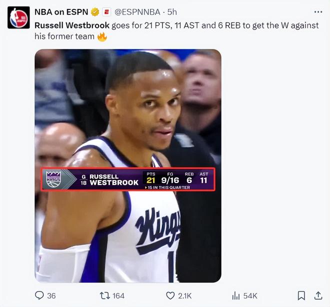 国王128-123险胜掘金拿到了本赛季第四场胜利,国王正值风雨飘摇之际能击败西部第二的掘金绝对是振奋人心的胜利,而拿下这场胜利的英雄是37岁的拉塞尔-威斯布鲁克。休赛期无人问津的威少如今却成为国王唯一的亮点。