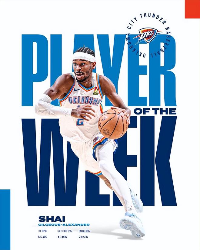 过去一周,亚历山大率队取得4胜0负的佳绩,他场均能得到31分4.3篮板6.5助攻2.0抢断,投篮命中率60%,三分命中率64.3%。