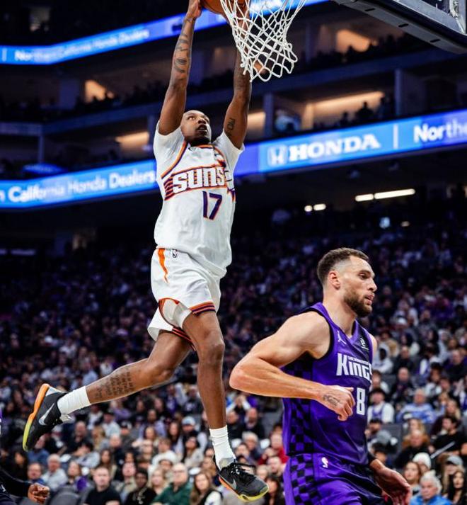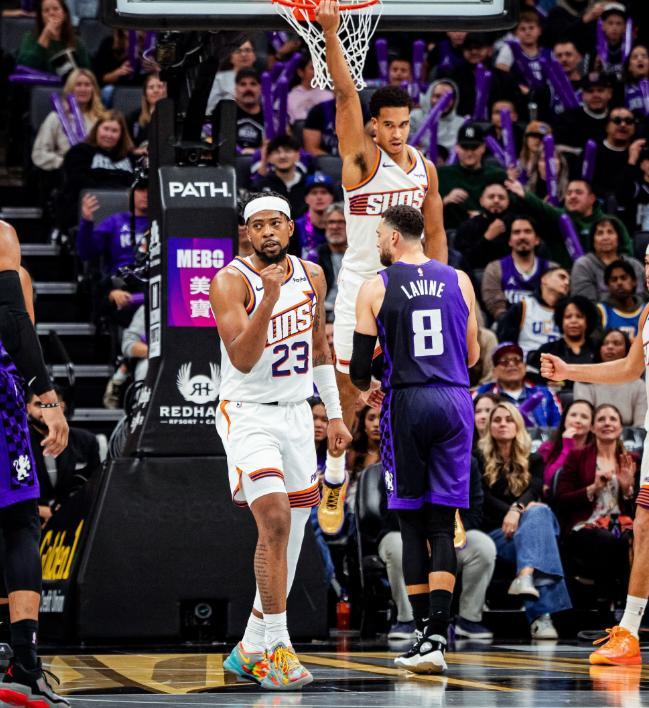 纸面阵容看起来不错的国王,本赛季表现惨淡的一个重要原因就是缺少配合,此役面对太阳,第一节全队助攻数为0,抛开手感的影响,也足以证明如今的国王进攻端更加仰仗球员的单打杜达,反观太阳打得完全是不同类型的篮球,首发后场双枪布克和吉莱斯皮,不仅第一节就得分全部上双,还一共送出了5次助攻,在二人的率领下,太阳第一节就飙下了41分,早早建立起了25分的巨大领先。