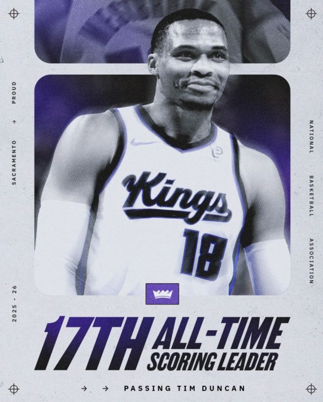 第二节还剩7分03秒,威少完成一个运动战进球后他的生涯总得分超过名宿蒂姆-邓肯(26496分)升至NBA历史得分榜第17位,德罗赞目前排在第24位,37岁的威少再度迎来里程碑。