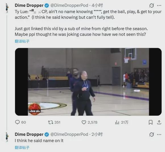 快船自媒体Dime Dropper发推称:“泰伦卢曾在训练场,隔空怒喷保罗拿球执行战术。”
