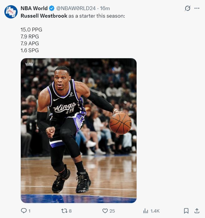 国王队官方也晒出推文祝贺拉塞尔-威斯布鲁克完成自己新的生涯里程碑。