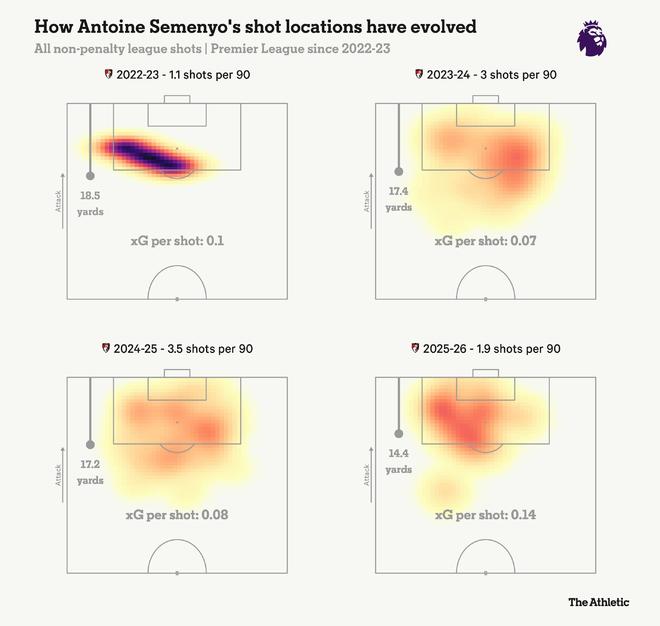 他理想情况下可以担任曼联3-4-3阵型中的右侧攻击型中场,但也能胜任两翼,并且具备防守意识,可以适应边翼卫的位置之一。阿莫林偏爱双脚均衡的边路球员,这使他能够指导锋线三人和边翼卫在进攻三区进行更多的轮转换位,从而更好地破解密集防守。这位加纳国脚快速的带球突破和大幅改善的射门状态(如下方图表所示,该图表显示他对射门的选择变得更加精挑细选),也将使他成为球队在由守转攻时的又一个出色的反击选择,而曼联在攻防转换阶段的威胁是最大的。
