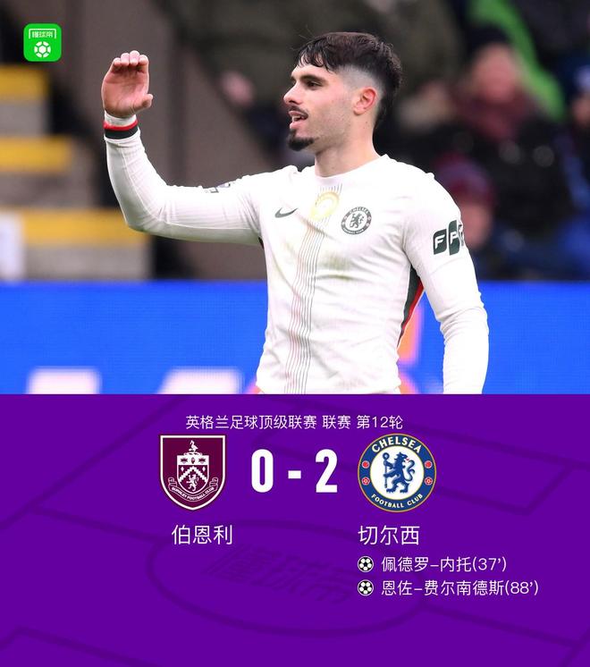 北京时间11月22日20:30,英超第12轮展开争夺,切尔西作客特夫摩尔球场挑战伯恩利,本场主裁判为彼得-班克斯。上半场,吉滕斯助攻内托俯身头槌破门。下半场,吉乌助攻恩佐破门锁定胜局。最终,切尔西2-0客胜伯恩利。