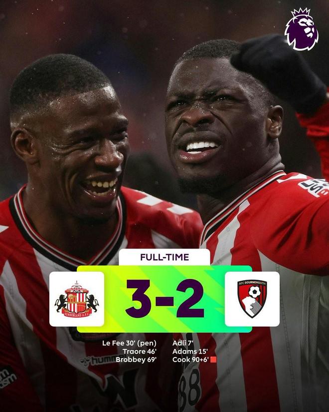 此役主场对阵伯恩茅斯,作为升班马的桑德兰在开场15分钟便0-2落后,随后桑德兰凭借凭借勒费埃、伯特兰-特拉奥雷和布罗贝伊各入一球,3-2逆转击败对手。