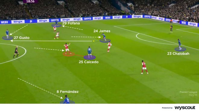 切尔西在4-2-3-1结构中,在阿森纳的赖斯前压盯防凯塞多时,通过右后卫古斯托内收接球。里斯·詹姆斯与凯塞多最初站位组成双后腰,但很快选择回落进入防线,通常落到右中卫附近的位置。与此同时,福法纳会随着古斯托的前提而向外侧移动。恩佐·费尔南德斯则通过向左侧游走,为古斯托让出空间,并常常能把自己的防守者苏比门迪带走。通过这些调整,马雷斯卡的球队拆散了阿森纳两名中场之间的联动,在中路制造了可向前推进的巨大空间(下图)。