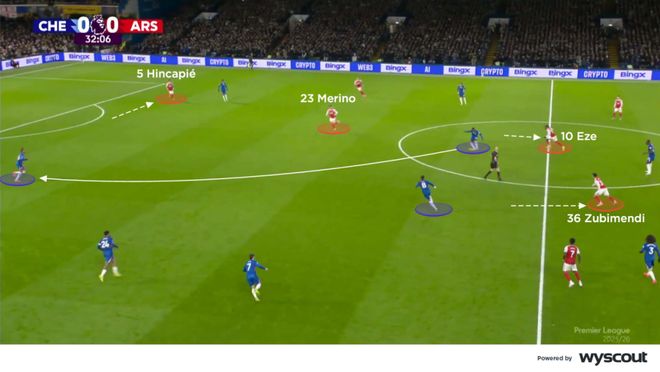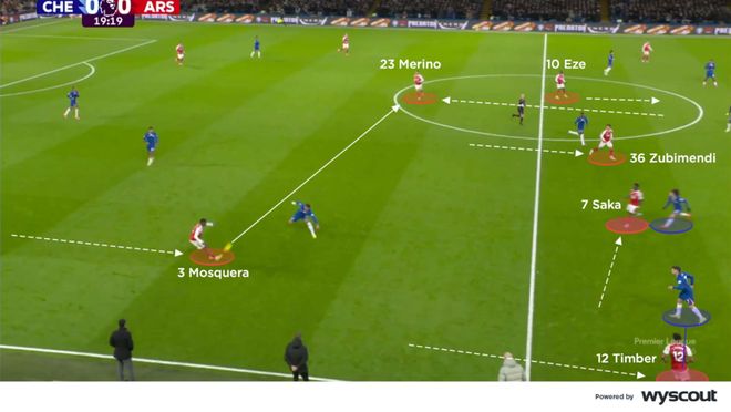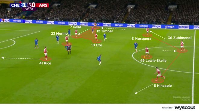 随着切尔西被罚下一人,阿尔特塔在半场用斯凯利换下卡拉菲奥里。这位替补成为阿森纳在三后卫结构前的主要中枢,他们试图通过控制球来打破切尔西的低位防守。苏比门迪落入两名中卫之间,而埃泽与萨卡、廷伯组成了右路三人组(下图)。左边的马丁内利与古斯托进行一对一,赖斯则在古斯托压出防守边锋时随时准备从肋部冲击禁区。梅里诺继续担任中锋,但比上半场位置更高,不再深度回撤。结果是阿森纳右路在下半场威胁更大,萨卡的传中也助攻梅里诺头球扳平比分。此前,切尔西在下半场早早取得领先。