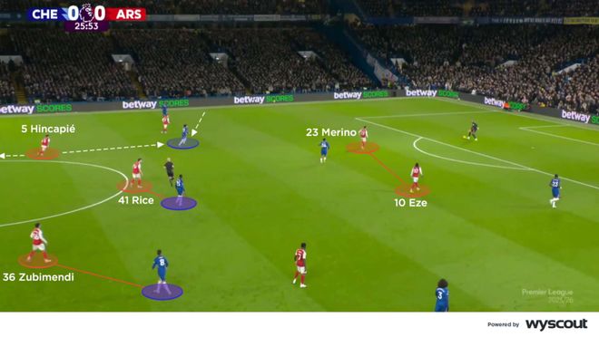 阿森纳的应对方式是让左中卫因卡皮耶前提防守。这位厄瓜多尔国脚站在一个比较灵活的中间位置,既能回收应对长传,又能及时前压限制内收的古斯托。有了这层中路的额外保护,赖斯与祖比门迪便能专注于盯防各自的对位对手,而不至于被中路打穿(下图)。阿森纳后防线的其他球员则负责处理长传第二点。但凯塞多在第二落点上的处理尤为出色,使切尔西在他被罚下之前依旧能从这些球权中发起进攻。