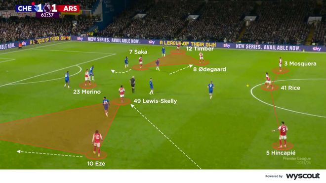 第57分钟,马杜埃凯换下马丁内利,厄德高则替下苏比门迪。阿森纳在两侧均形成了边路的三角组合,通过三人轮转配合发起进攻。埃泽支援左侧,斯凯利前提,赖斯则在控球时落位于两名中卫之间。厄德高作为另一名左脚球员加入右侧,与萨卡形成双左脚搭配,身后是廷伯的套上(下图)。阿森纳的右路继续展现出足够的穿透力,主要来自萨卡与厄德高的内收配合。